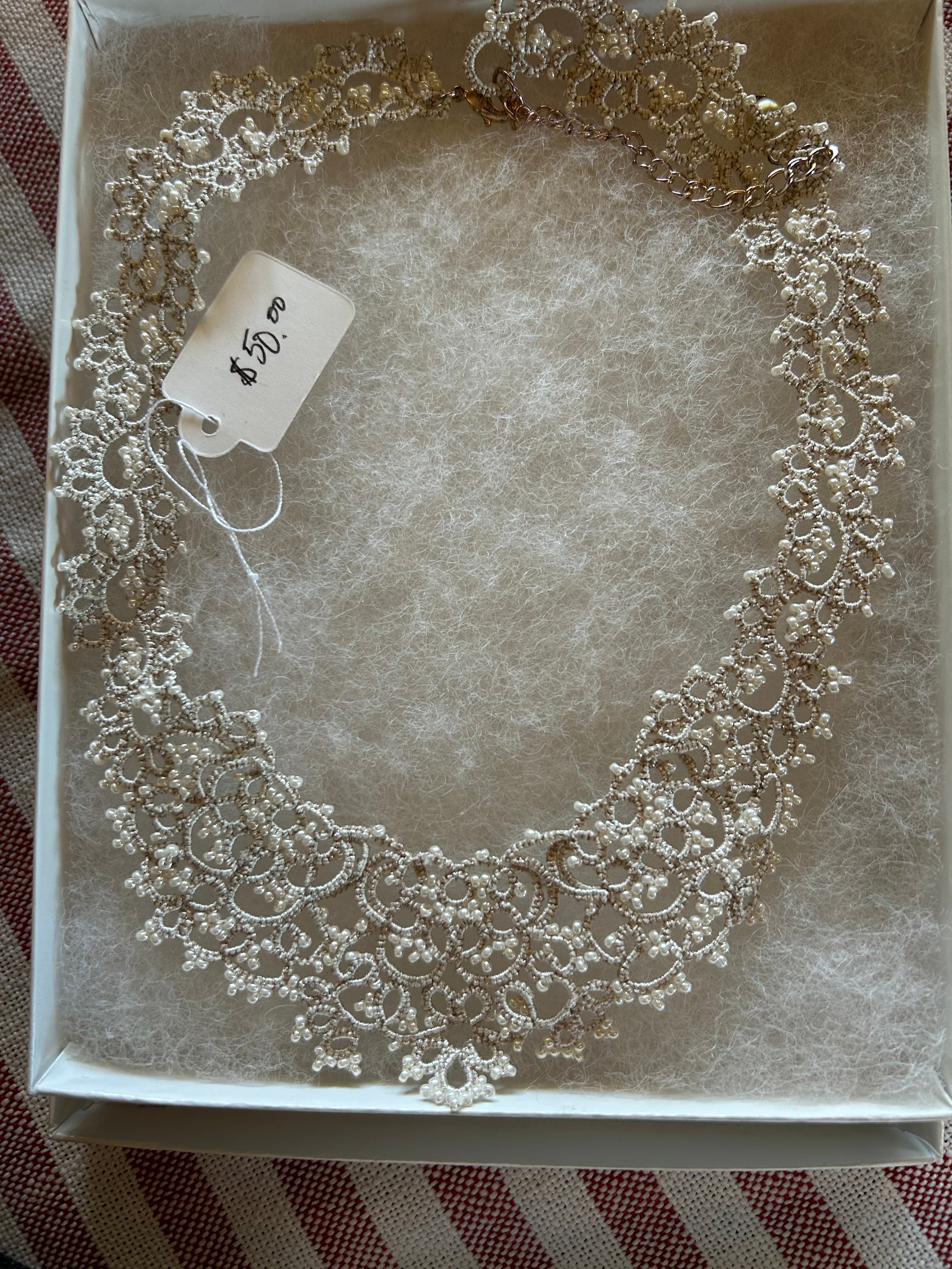 You will look amazing in this hand tatted silk thread and seed pearl necklace! Go from a choker to a longer look with the adjustable length closure. This stunning piece is truly unique and is so beautifully crafted in Moldova that it will truly be an heirloom.