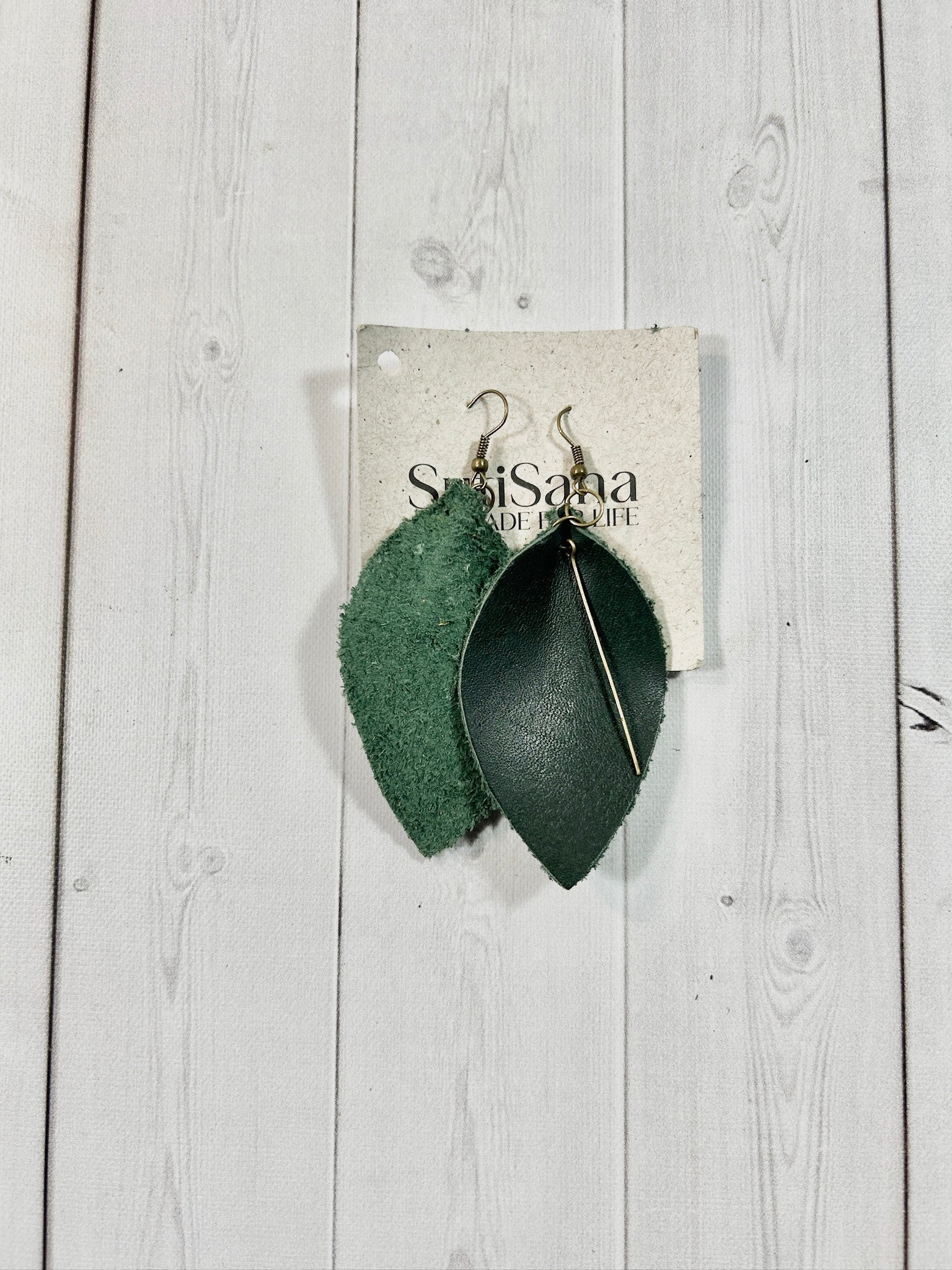 Leather Leaf Earrings Sale! from 1500 /per Qty. Add to Cart This item is currently on backorder but you can still purchase it now and we'll ship as soon as more become available. Bold and elegant, these Leather Leaf earrings catch the eye with a touch of brass. Handmade by surivors at Sutisana. Materials: Upcycled vegetable-tanned leather with brass hardware Height: 2" Width: 1 1/2"
